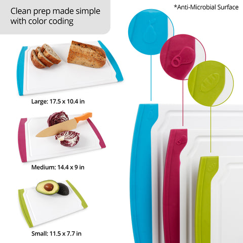 - Reversible color and icon-coded cutting boards help prevent cross-contamination among different food types